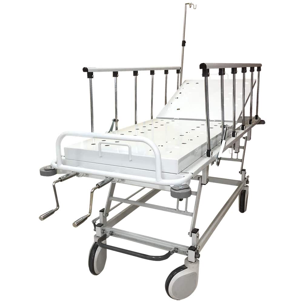 Camilla mecánica, rodable con altura variable para facilitar la transportación segura del paciente.