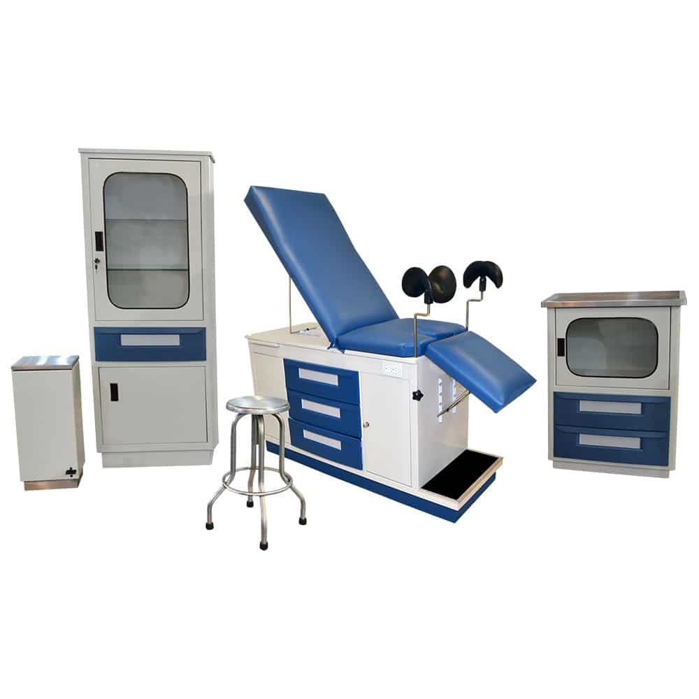 Set integrado por: Mesa de exploración modelo Hamilton, Vitrina sencilla para consultorio, Gabinete clínico, Bote con pedal, y Banco giratorio.