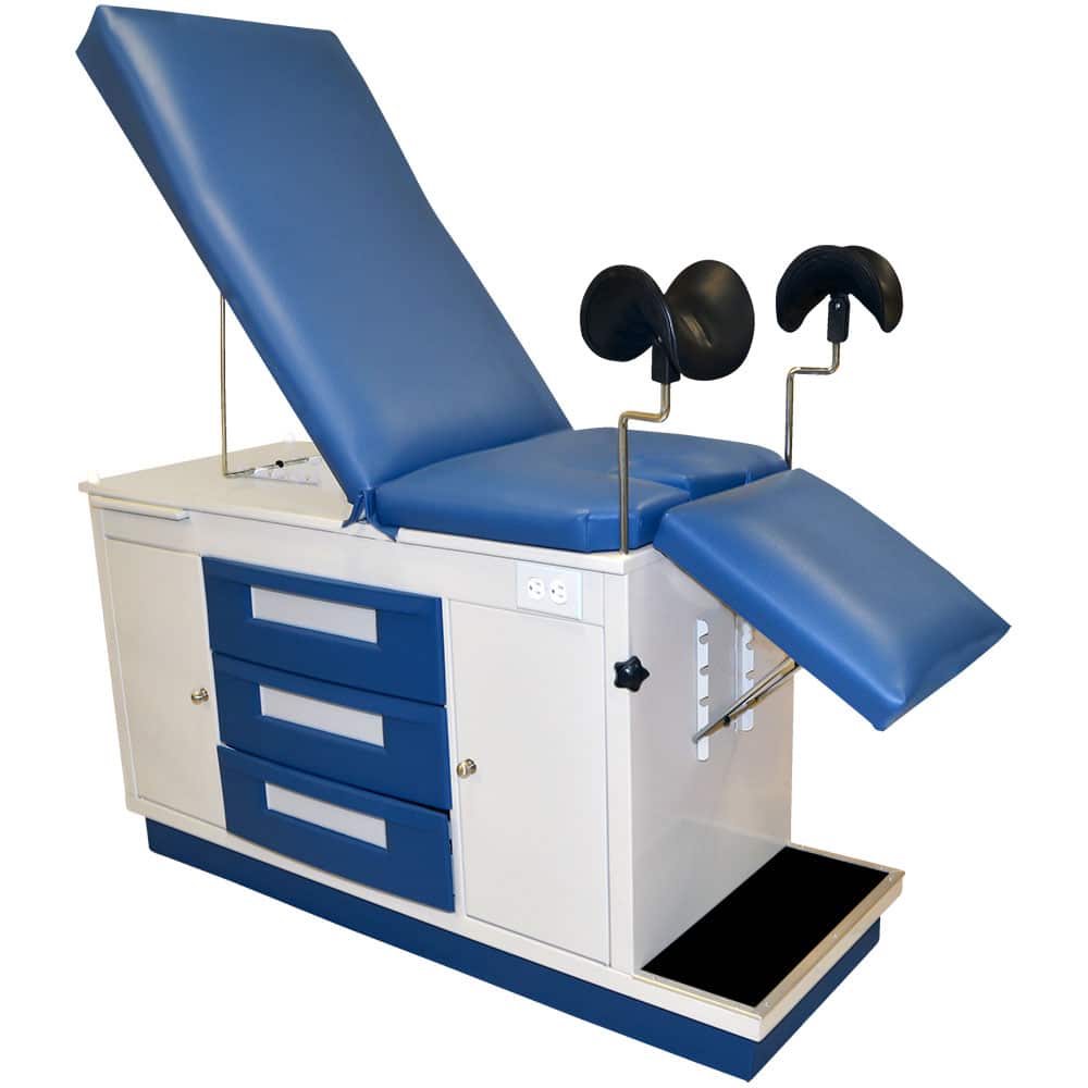 Accesorios: Taloneras retráctiles de aluminio, charola recolectora de líquidos,, porta rollo, pierneras de plástico acojinadas, sistema eléctrico con dos tomas de corriente, pistón neumático, porta piernas, cajón de plástico.