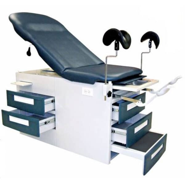 Accesorios: Taloneras retráctiles de aluminio, charola recolectora de líquidos,, porta rollo, pierneras de plástico acojinadas, sistema eléctrico con dos tomas de corriente, pistón neumático, porta piernas, cajón de plástico.