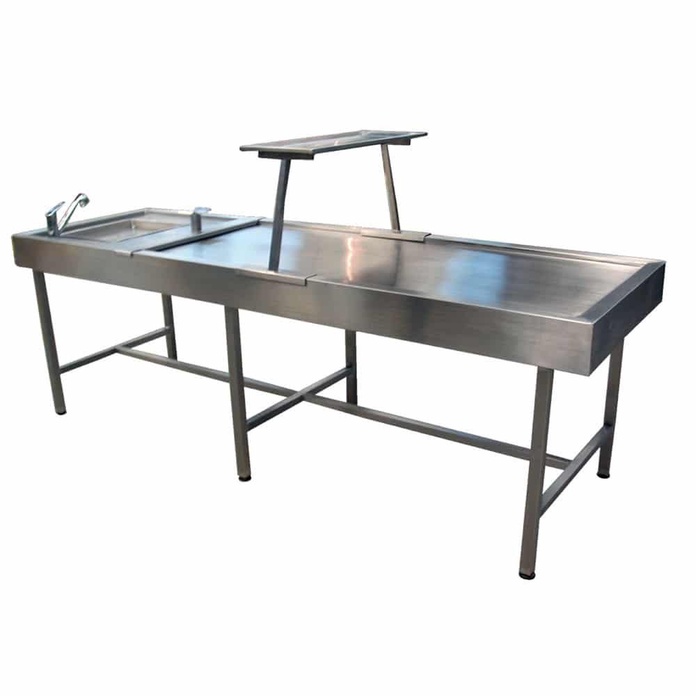 Construida en perfil cuadrado de acero inoxidable, cubierta fabricada de lámina de acero inoxidable con tarja en uno de los extremos del mismo material con contra canasta, con charola, soporte para cuello y tabla para instrumental.